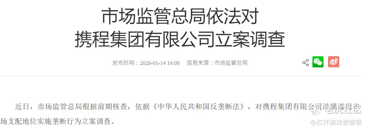 2026年1月14日,市场监管总局公告,依据《中华人民共和国反垄断法》对携程集团涉嫌滥用市场支配地位行为正式立案调查。