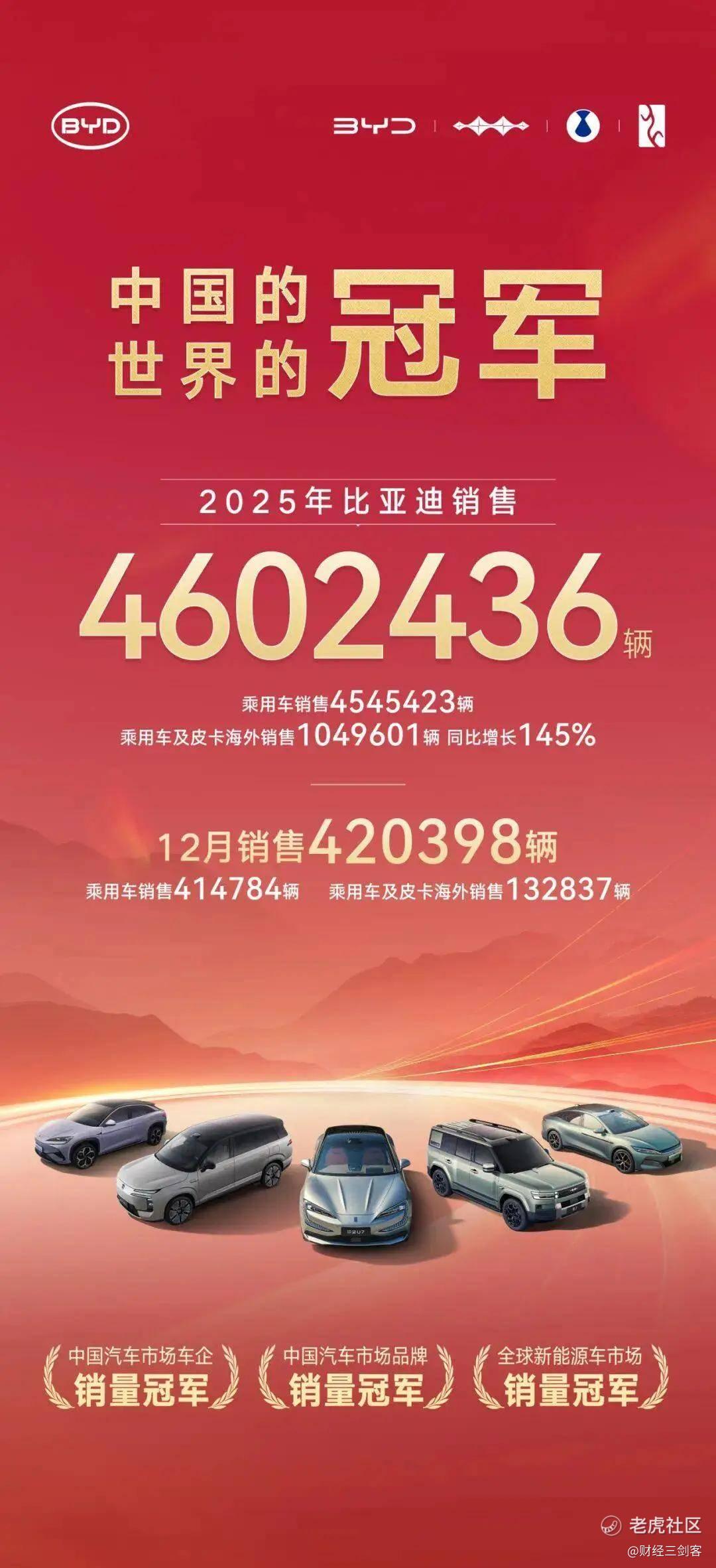 $比亚迪(002594)$ 2026年1月1日,比亚迪公布2025年销量数据:2025年,比亚迪全年累计销售4602436辆,同比增长7.73%。其中,乘用车销售4545423辆。乘用车及皮卡海外销售1049601辆,同比增长145%。海外出口全年销量首次突破100万辆。