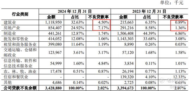 在公司贷款中,建筑业和房地产业为不良贷款重灾区,截至2024年末不良贷款余额共34.29亿元,其中建筑业、房地产业不良贷款余额占比最高,分别为32.63%、24.92%,这两个行业不良率大幅增长,建筑业不良率由0.89%增至4.5%,房地产业不良率由1.36%增至7.17%,均达到成立以来的最高水平。