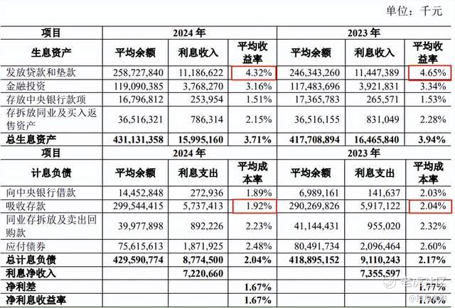 2024年,贷款平均收益率为4.32%,同比下降0.33个百分点;存款平均成本率为1.92%,同比下降0.12个百分点,净息差由1.76%降至1.67%。