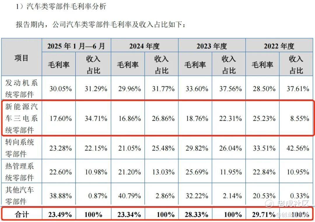 其中,新能源汽车三电系统零部件毛利率分别为25.23%、18.76%、16.86%和17.60%,低于公司其他产品的毛利率水平,且整体处在下滑趋势。