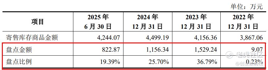 然而,剔除上述寄售库存商品余额后,国金证券对各期末可实施监盘程序寄售库存商品的监盘比例分别为0.47%、83.36%、71.56%和28.83%,在2022年末和2025年6月末同样偏低。