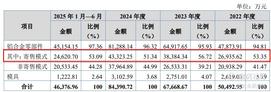 铝合金零部件是主要收入来源,占公司主营业务收入的比例在九成以上。其中,2022年至2025年上半年(以下简称“报告期”),汽车类零部件的销售金额占主营业务收入的比例则高达88.78%、92.04%、94.55%和95.42%。