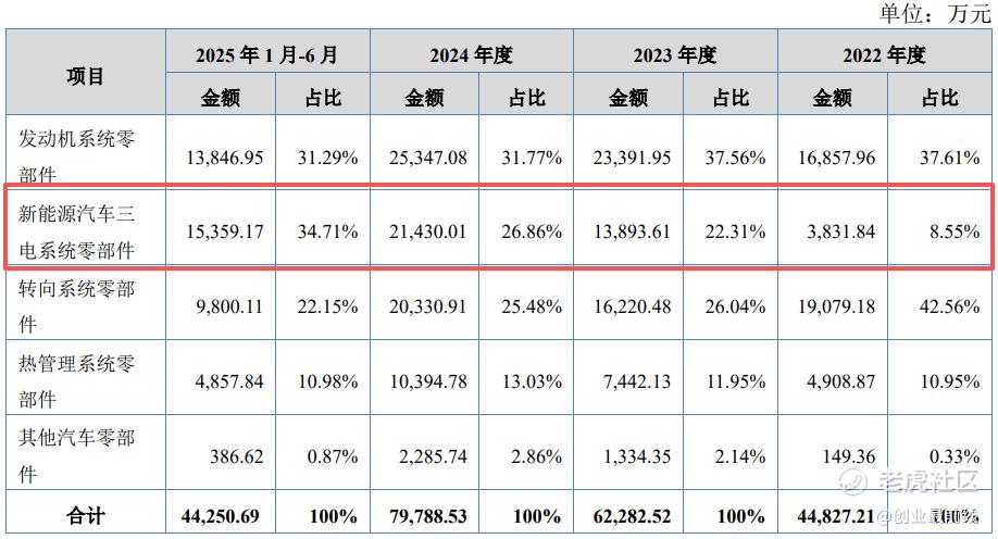 报告期内,新能源汽车三电系统零部件销售金额分别为0.38亿元、1.39亿元、2.14亿元和1.54亿元,销售占比从2022年的8.55%激增至2025年上半年的34.71%。