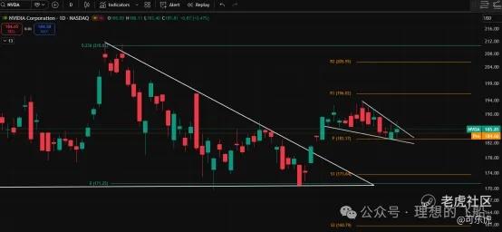 七、NVDA:(优)小挤压楔形。183和173的支撑都很强。(2026年2月25日盘后))走势预判:突破下图的小挤压楔形之后慢慢向上。