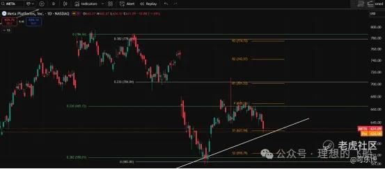 八、META:有点小破位,短期内再跌破620,下一支撑595附近(铁低)。(财报:2026年2月4日 盘后)走势预判:小震荡,临近财报走高。中长期看好,本年度应该可以到896以上。