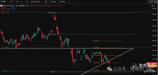 四、MSFT:昨晚已经跌出图1所示的白色楔形,下一档强支撑460附近 (财报:2026年1月28日)走势预判:财报前小调整庄家故意而为。495(颈线)》510(大概率)》527(小概率)
