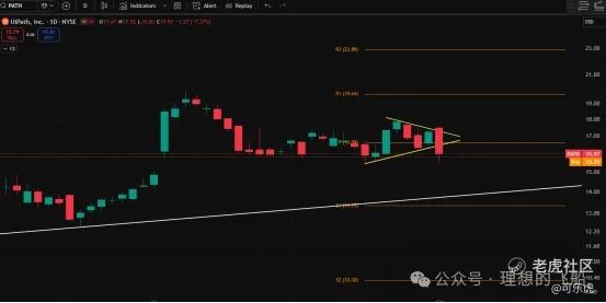 十六、PATH:昨晚已经跌破挤压楔形,15.8的支撑很很关键,看它能不能守住。