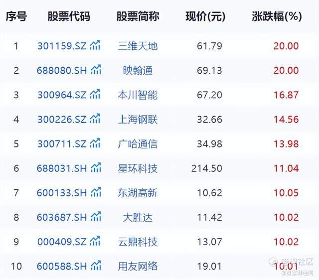 截至收盘, $三维天地(301159)$ 、映翰通(688080.SH)、东湖高新(600133.SH)、大胜达(603687.SH)、云鼎科技(000409.SZ)、用友网络(600588.SH)等多股涨停, $本川智能(300964)$ 、上海钢联(300226.SZ)、广哈通信(300711.SZ)、星环科技(688031.SH)等涨超10%。