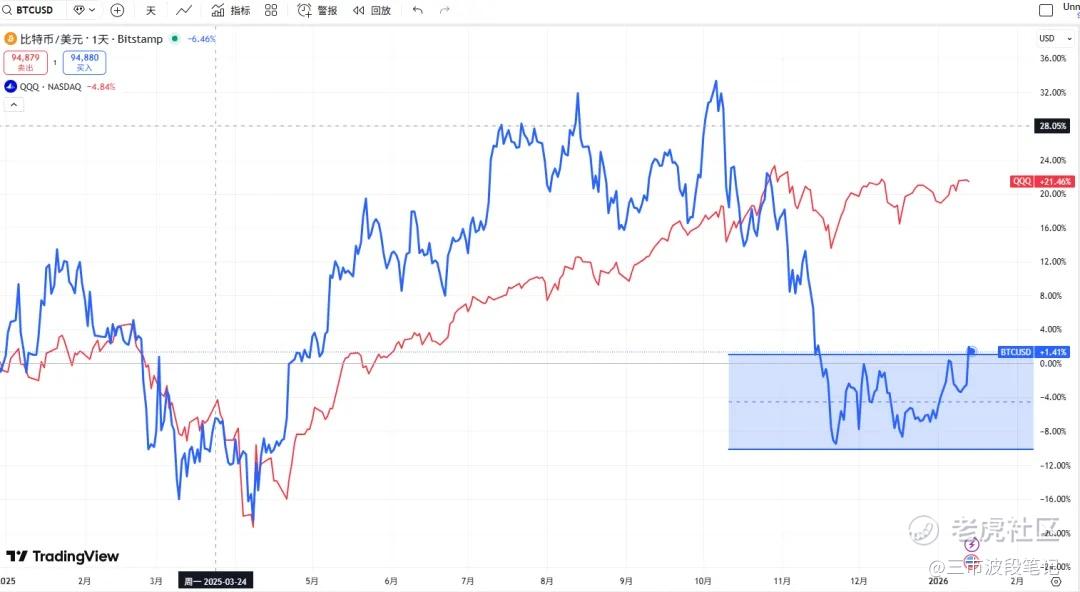 如果把统计时间去年1月拉齐到今年一月,我们会发现相对于QQQ的涨幅,BTC的涨幅还有20%的差距。