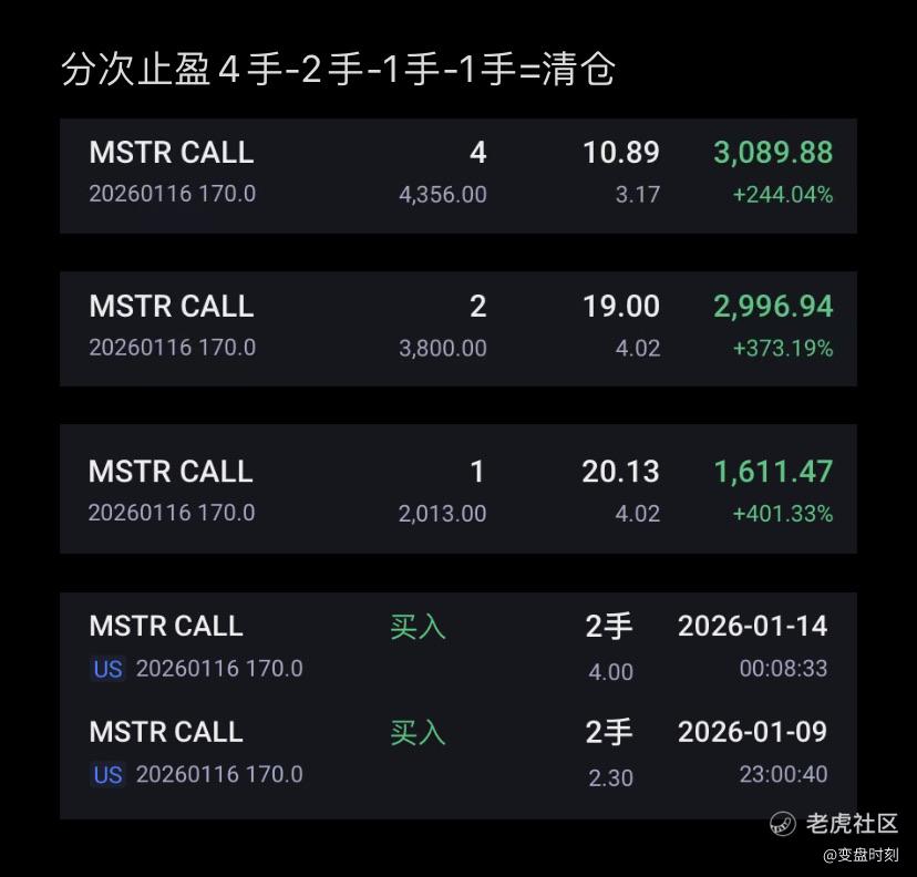 $Strategy(MSTR)$ 买爆成功,4手其中有2手CALL成本在2.3美元,19+止盈的有800%涨幅。恭喜~ $Coinbase Global, Inc.(COIN)$ $MARA Holdings(MARA)$ $IREN Ltd(IREN)$