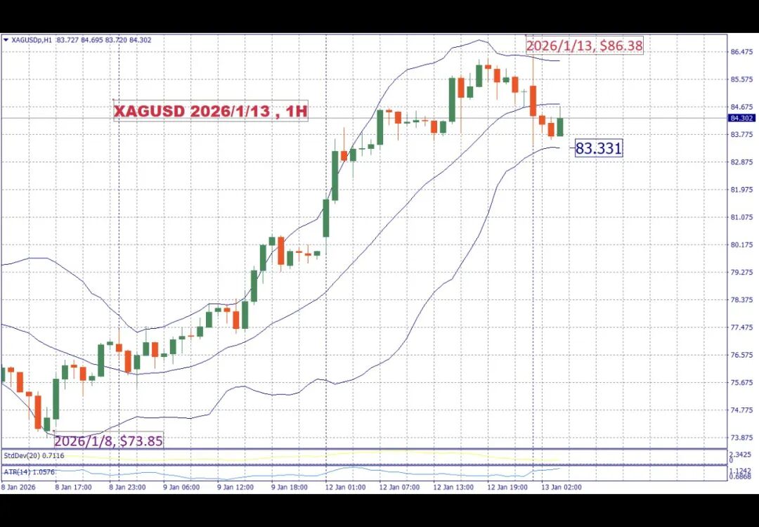黄金和白银昨天再创新高,黄金最高$4630.11,白银最高$86.248。白银今天高开$86.386,但回落在$83之上。