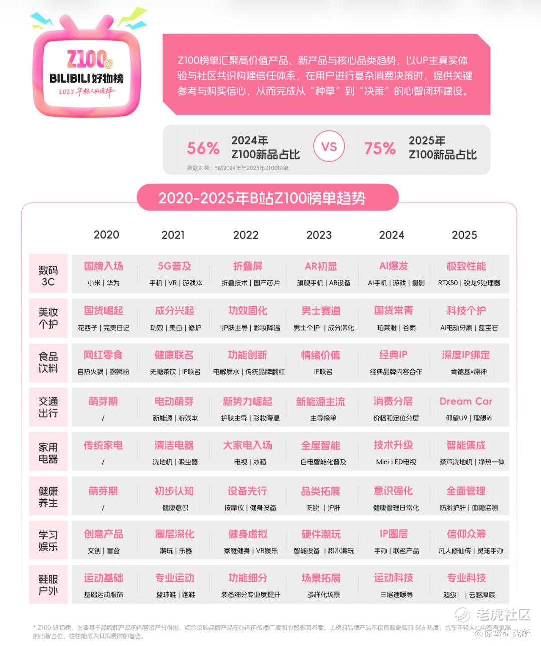 这种观念其实早已悄然渗透到年轻人的日常生活之中,并推动更多年轻消费者追求生活品质的进阶。从B站“Z100好物榜”呈现出的热门品类趋势可以看出,在2020年到2025年间,健康领域从养生意识觉醒的初步认知,逐步进阶到以防脱、护肝、血糖监测为代表的日常化、可量化的全面健康管理;在个护上,从追求“美白”“修护”等功效,深化为对成分与配方的科学审视;在居家场景中,消费品类从大小家电、全屋智能延伸至蒸汽洗地机、净热一体机等智能集成的品质解决方案。