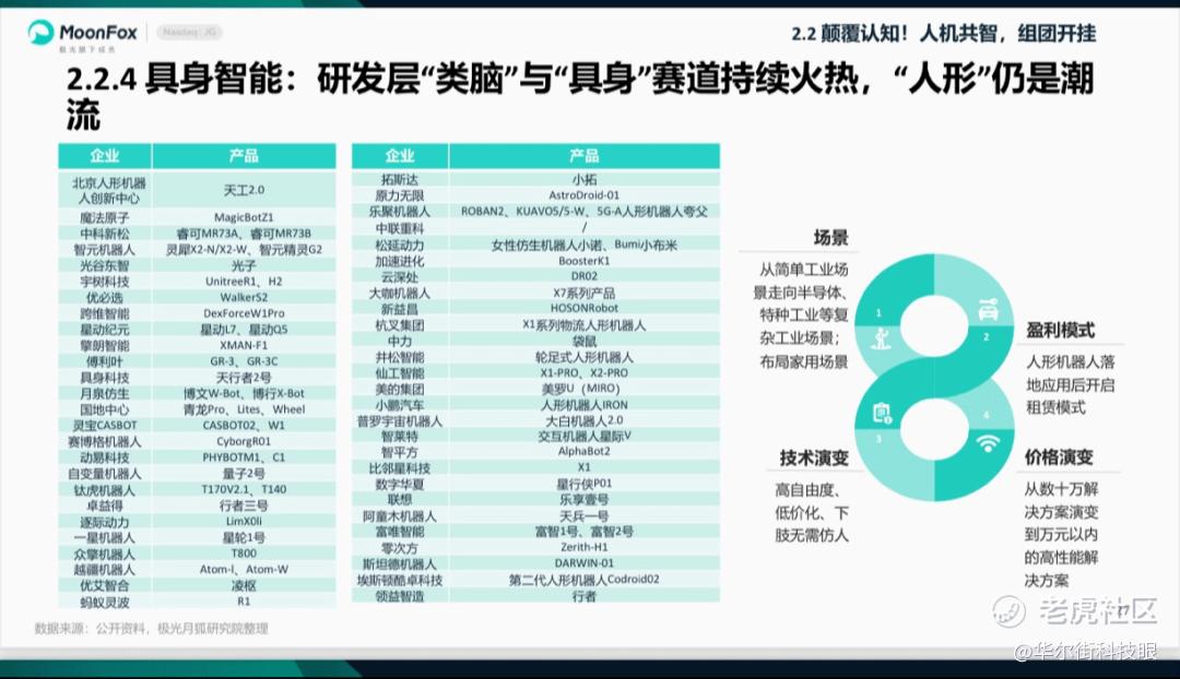 场景落地的攻坚同样刻不容缓,“工业先于物流,商用先于家用”的商业化路径,成为企业争抢生存赛道”。对于行业整体趋势月狐数据方面也有相关研究,目前应用场景已从工业单一作业拓展至居家服务、医疗保健等生活领域;盈利模式也愈发多元,涵盖人形机器人属地化运营、租赁等形式,产品价格从数万元向万元内下探,性价比提升推动市场化普及。