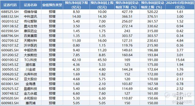 以预计净利润变动幅度上限来看,1家公司预计净利润变动幅度上限超5倍,6家公司预计超3倍,29家公司预计实现翻倍。其中, $佰维存储(688525)$ 预计2025年实现归母净利润8.5亿元至10亿元,同比增长427.19%至520.22%。