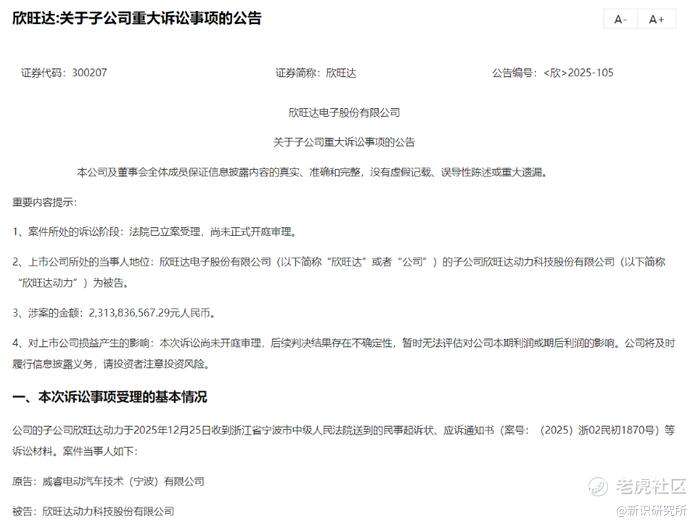 值得注意的是,此次电池召回争议发生前,欣旺达已与吉利系公司存在法律纠纷。2025年12月,欣旺达发布公告称,其子公司欣旺达动力遭到吉利控股集团旗下威睿电动汽车技术(宁波)有限公司起诉,索赔金额高达23.14亿元。据悉,该诉讼的起因是欣旺达动力在2021年6月至2023年12月期间交付的电芯被指存在质量问题。