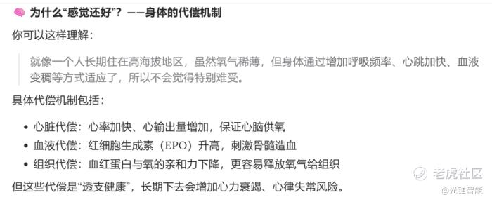 比起列对应的病症、摆术语,下结论,M3多了一个解释原因的部分。还以上述的贫血为例,M3用一般人更能看懂的方式打了个比方,好比高海拔地区缺氧时人体启动的调整,贫血是用心脏代偿、血液代偿和组织代偿完成了自身调整,同时提醒用户它以“透支健康”为代价,阐述风险,提示用户尽快就医。
