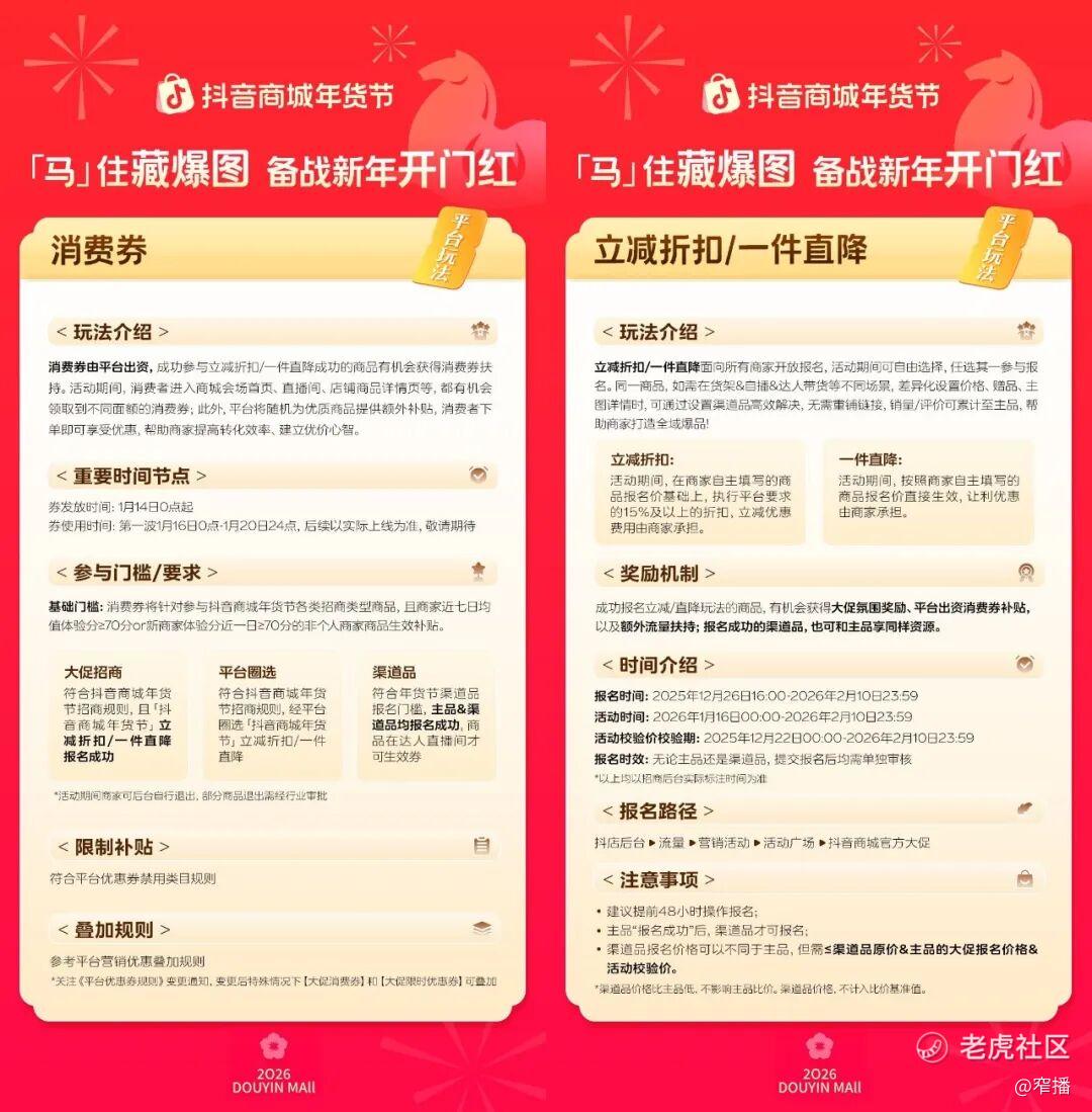 今年抖音电商推出的「一件直降 / 立减折扣」「平台消费券」等核心玩法,正是帮商家激活全域流量、打通这条转化回路的关键抓手。这些简单直接的优惠不仅降低消费者的决策门槛,也是贯穿内容场到货架场的年味氛围放大器。而参与这两大核心玩法的商家,也能快速获得全域的流量扶持,更快实现生意爆发。