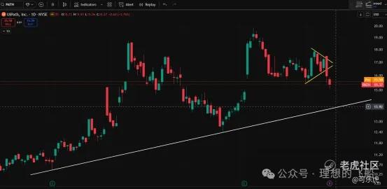 十六、PATH:已跌破挤压楔形,15.8的关键支撑已破,这两天再回不到15.4,得先卖掉,涨回15.4了再接回来。