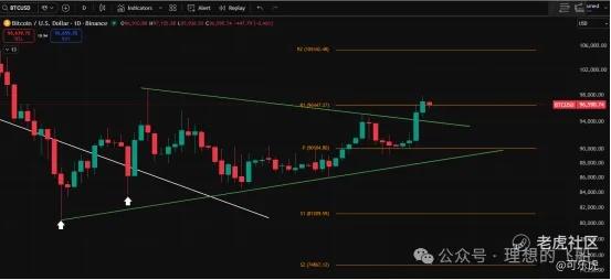 1、已经突破下图中的绿色挤压楔形,并站上短期压力9.64万,目前看着还不错,上方压力10.3万。