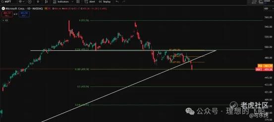 四、MSFT:昨晚已经跌出图1所示的白色楔形,下一档强支撑460附近 微软的基本面不弱可以关注,能否站上481是关键。 (财报:2026年1月28日)