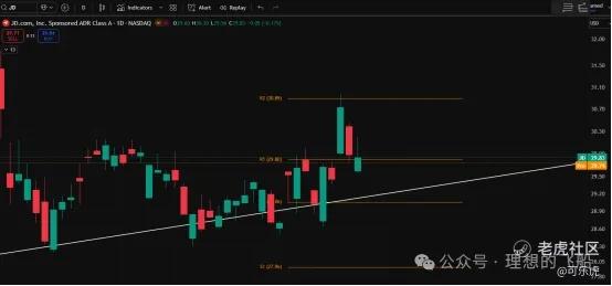 二十一、JD 29.8是压力也是支撑。周K线挤压了好久,是底部了,这支中概可能比较无趣,谨慎参与。