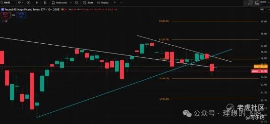 5、MAGS(7姐妹ETF)昨晚跌出挤压楔形,今晚盘前收回去了一些,上方压力65.9下方支撑:64.3、62.8 财报季前波动会比较大,庄家有先砸盘,临近财报了再拉升的可能,大家控制仓位。