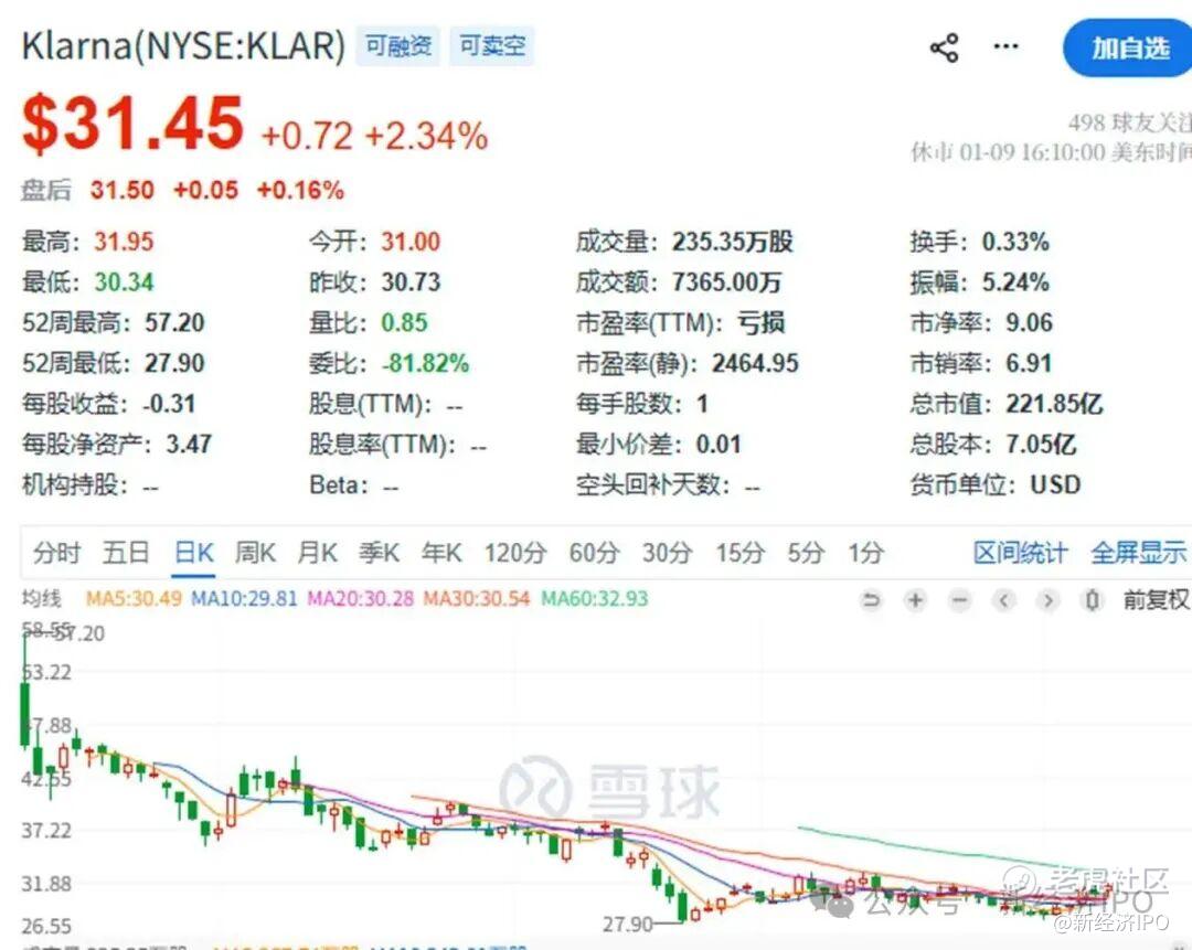 截至2026年1月9日,Klarna的股价收于31.45美元,较40.00美元的发行价下跌约21 %,较IPO发行价下跌8.45美元。该公司总市值约222亿美元,静态市盈率高达24645倍。