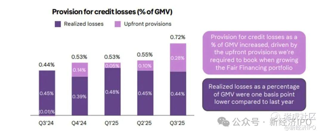 当产品从“短周期、低额度”的支付延后,逐步走向“更长周期、更高利率”的融资分期,风险结构会发生变化。短期BNPL的风险更多来自少数用户的拖欠与欺诈,而长期分期更接近银行信用卡等传统消费金融,风险不仅取决于用户还款意愿,还取决于宏观周期、就业与收入波动。更长的期限意味着更长的暴露时间,任何一个外部变量的变化都可能在时间里被放大。于是,信用损失计提上行就不再像一次性事件,而更像一条可能持续抬升的曲线。