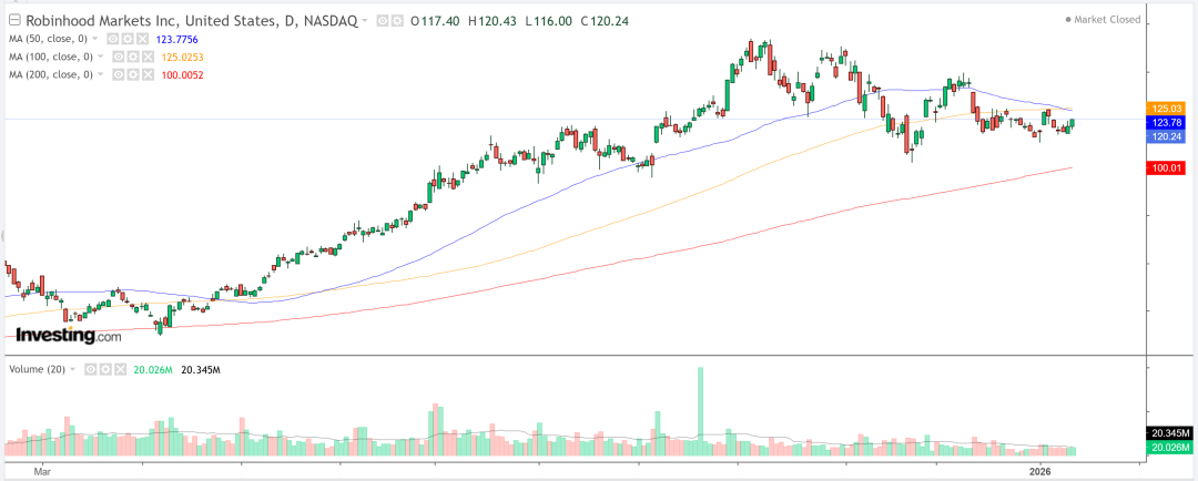 2025年,罗宾侠股价累计飙升200%。其增长势头主要源于一系列激进的功能更新,包括推出预测市场、升级加密货币交易服务以及上线退休账户业务。