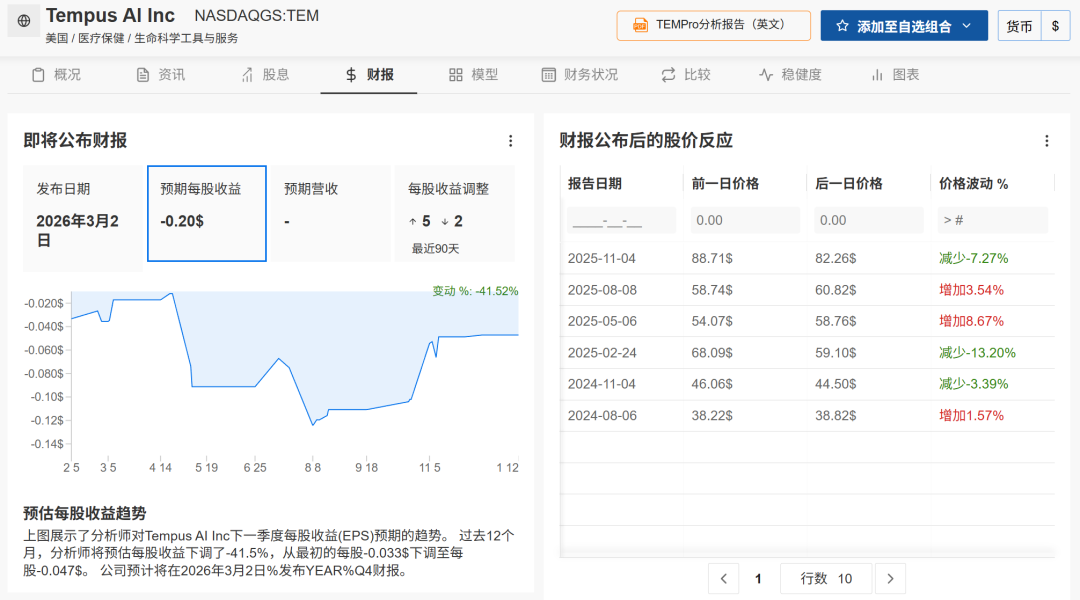 4. 坦帕斯人工智能公司(Tempus AI)财报发布日期: 3月2日预计每股收益增长: +90.4%(同比)预计营收增长: +80.1%(同比)