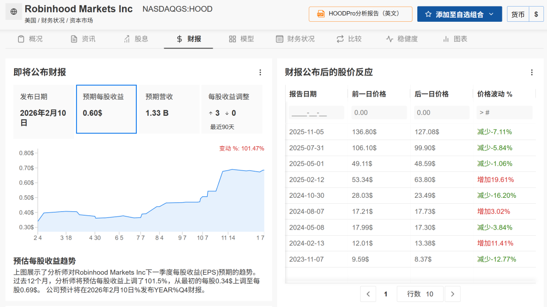1. 罗宾侠(Robinhood)财报发布日期: 2月10日预计每股收益增长: +51.1%(同比)预计营收增长: +31.7%(同比)