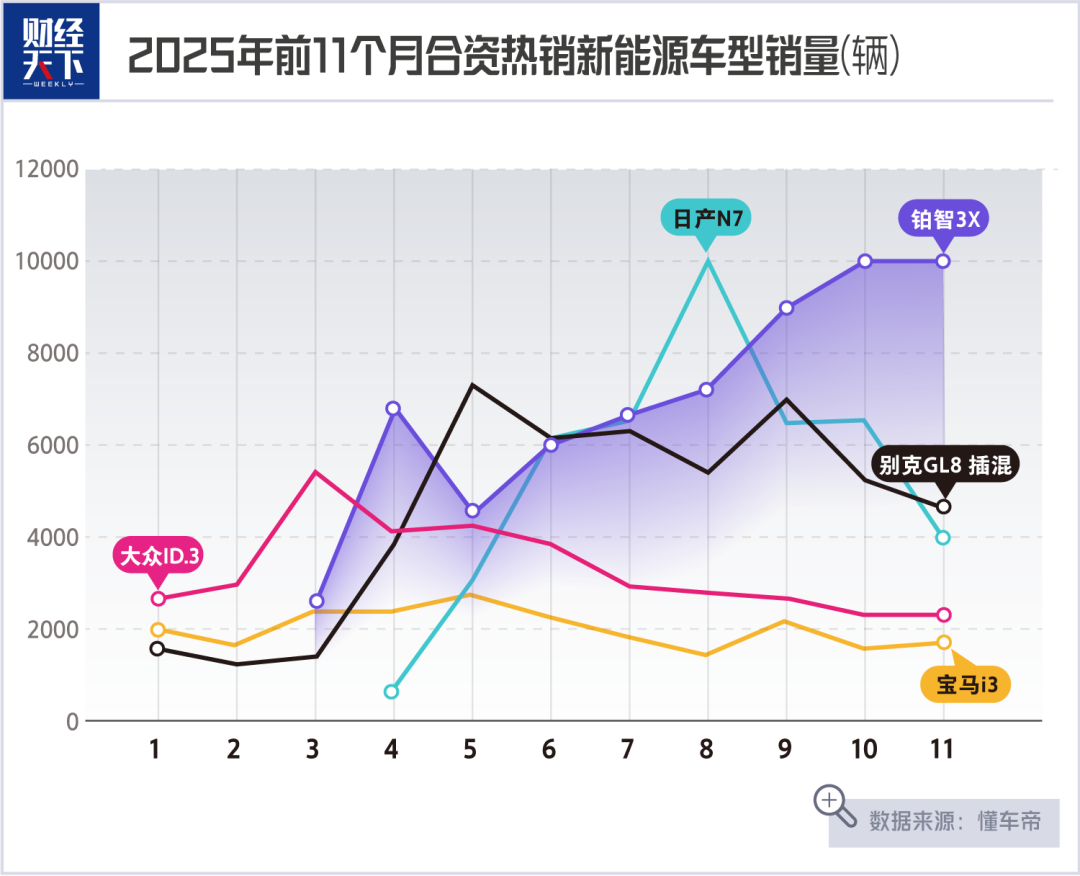 易车整理的乘联会数据显示,2025年3月上市后,铂智3X的累计销量超过了7万辆,成为合资品牌新能源车的销量冠军,月均销量约7000辆。排在第二名的是别克GL8插电式混合动力版,累计销量超过5.5万辆。第三名是2025年4月推出的日产N7,其累计销量超过4.5万辆,8月份也取得过月销破万的成绩。