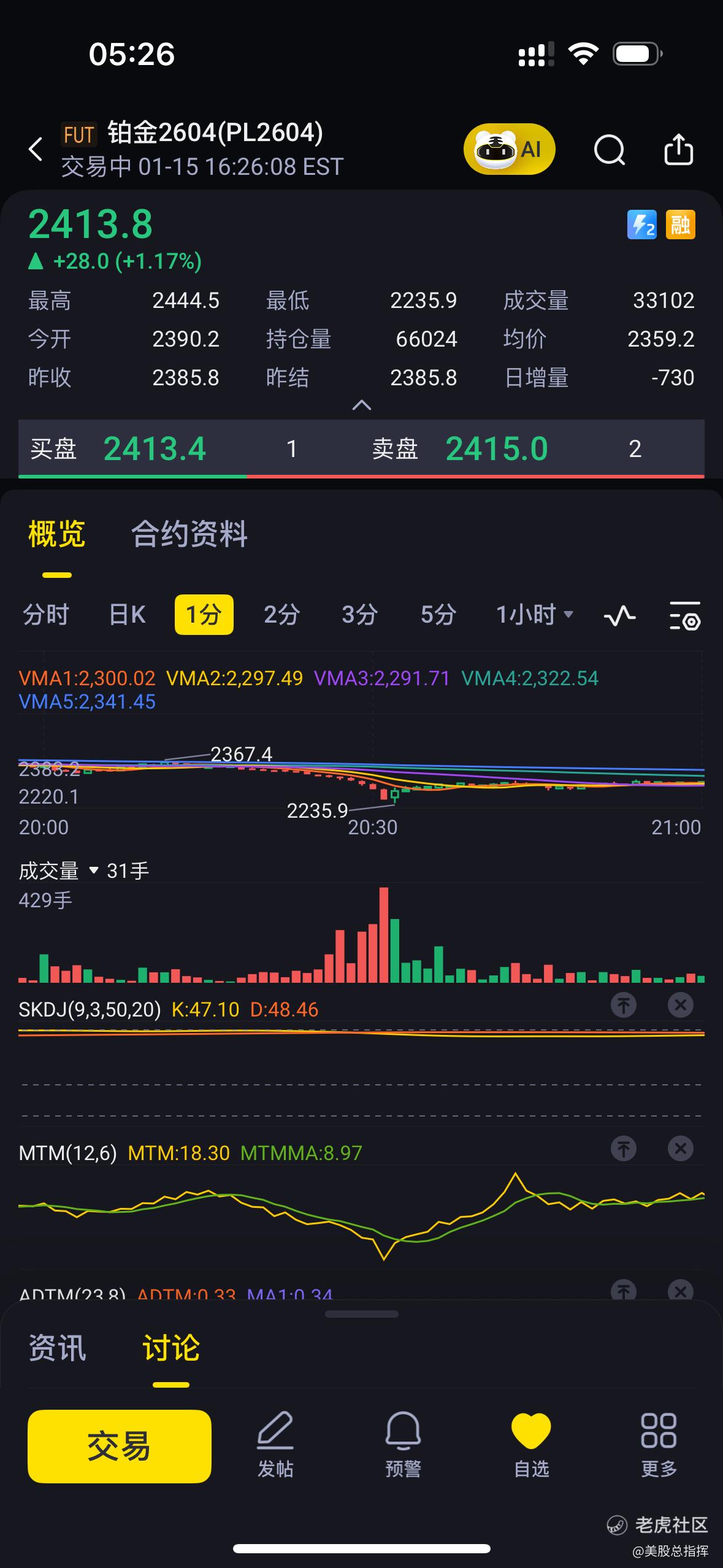 $铂金2604(PL2604)$ 一路下跌📉 成交量逐步放大,到最后跌幅和成交量都达到最大,接下去就是反转的时候了,买点可以设定在一分钟线前低稍微靠上一点的位置 ,这样交易就会更有性价比!之后横盘要拿住 等待时间验证!$游戏驿站(GME)$ $AMC院线(AMC)$ $CME比特币主连 2601(BTCmain)$ $白银主连 2603(SImain)$