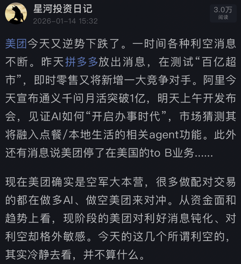 阿里AI融入外卖和本地生活也正常,AI agent是趋势浪潮,作为业界空头当然要做的,而且外界寄予厚望,这是阻挡不了的。AI这部分,阿里国内最大的竞争对手还是豆包,豆包日活都过亿了,千问月活才过亿,从普及程度和实际体验上,豆包现在确实更占优,阿里这块得加把劲了。