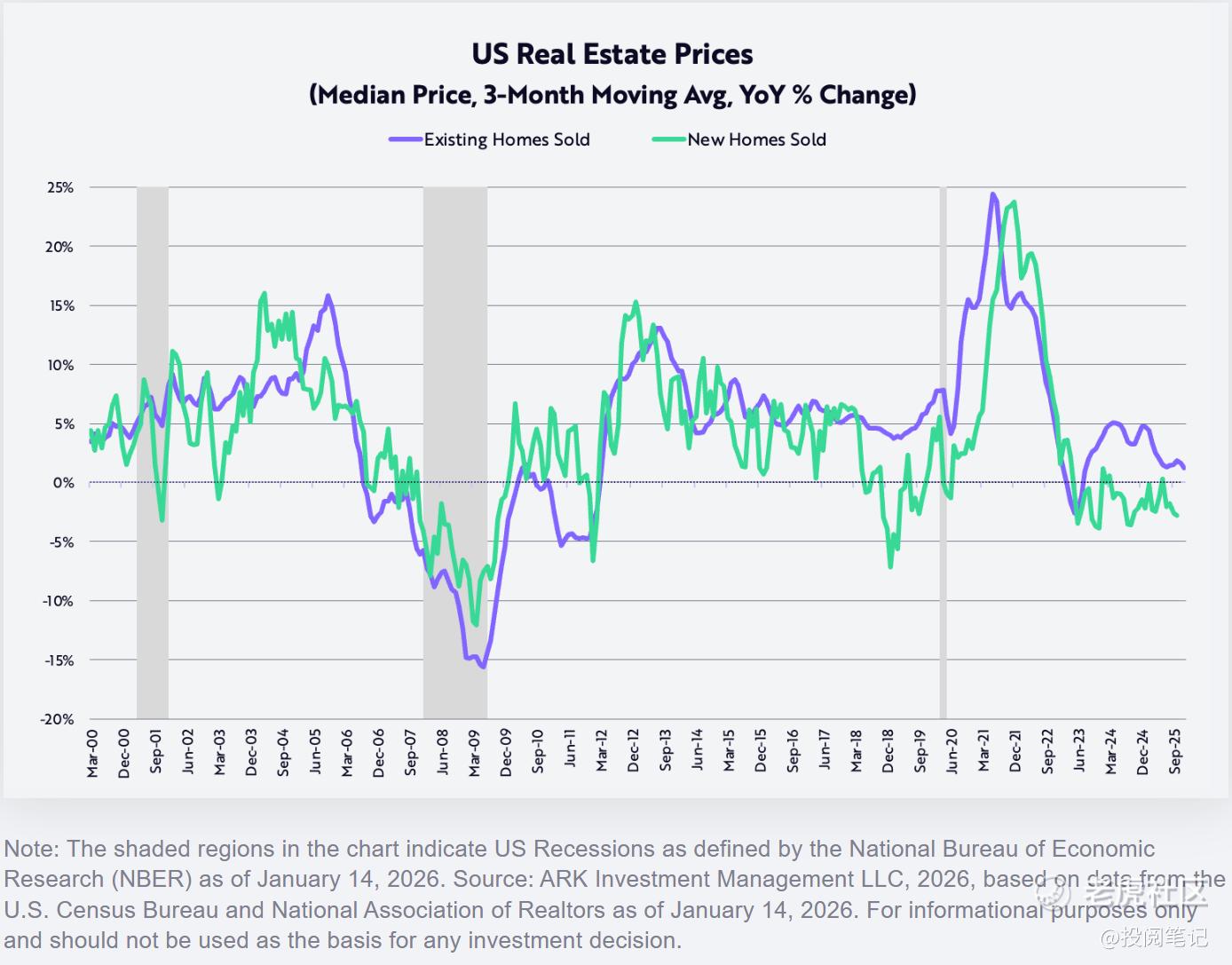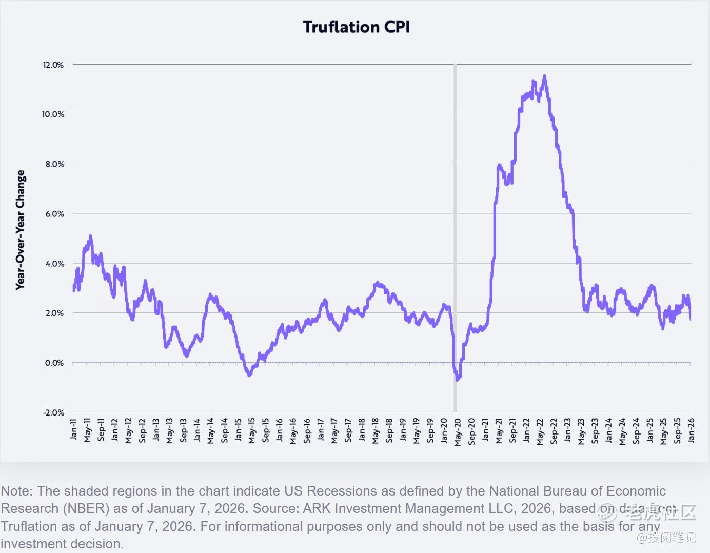 在多数人担忧“滚动式衰退”与高估值风险时,Wood却指出,美国经济如同一根“蓄势待发的弹簧”,在经历了严厉货币政策的压制后,即将在放松管制、技术通缩与生产力爆发的多重驱动下,迎来强劲的V型反弹。她更是做出了一个惊人预测:通胀不仅会消退,甚至可能转为负值。
