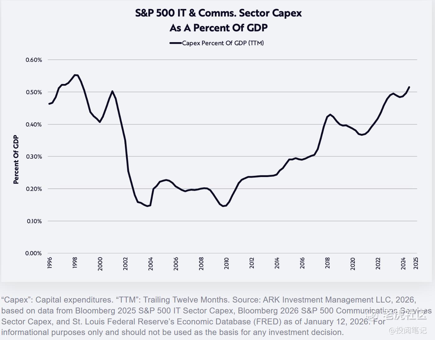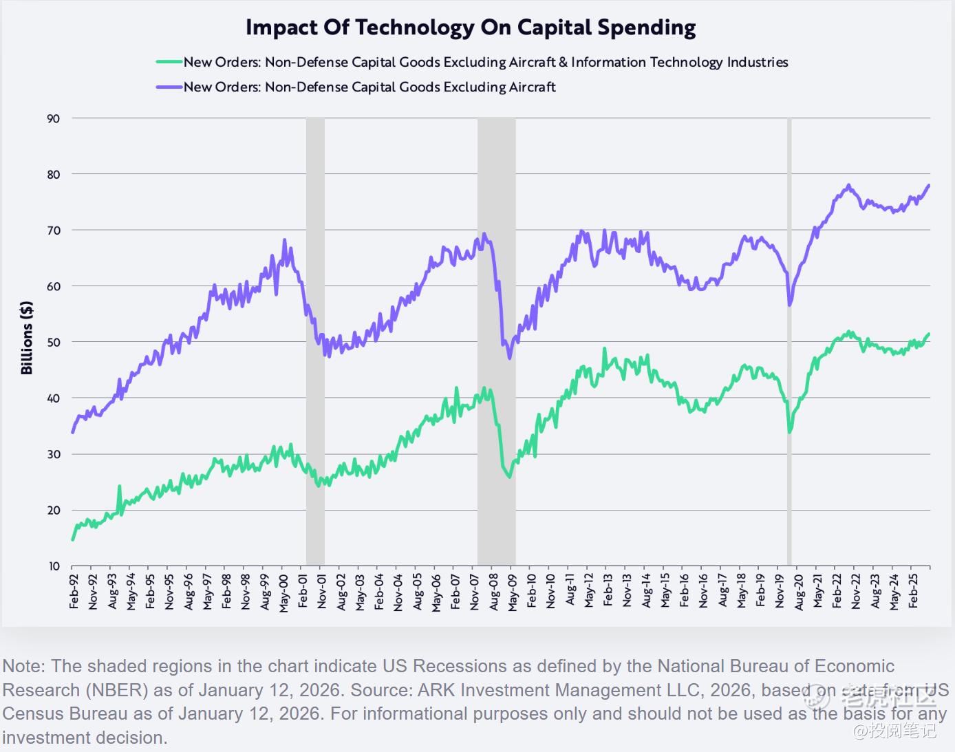 与此同时,以非国防资本货物(不含飞机)衡量的资本支出在2022年中期达到峰值,无论是否包含技术领域,该指标目前均已回落至该水平。事实上,自科技和电信泡沫破灭以来,这项资本支出指标在二十余年间始终难以突破,直至2021年新冠疫情引发的供应冲击迫使数字与实体投资同步加速。曾经的支出上限如今似乎已转化为支出下限——人工智能、机器人技术、能源存储、区块链技术及多组学测序平台均已蓄势待发。经历九十年代科技泡沫后的二十年平台期(峰值约700亿美元),当前正酝酿着史上最强大的资本支出周期(见下图)。我们认为,人工智能泡沫尚需数年才会形成!