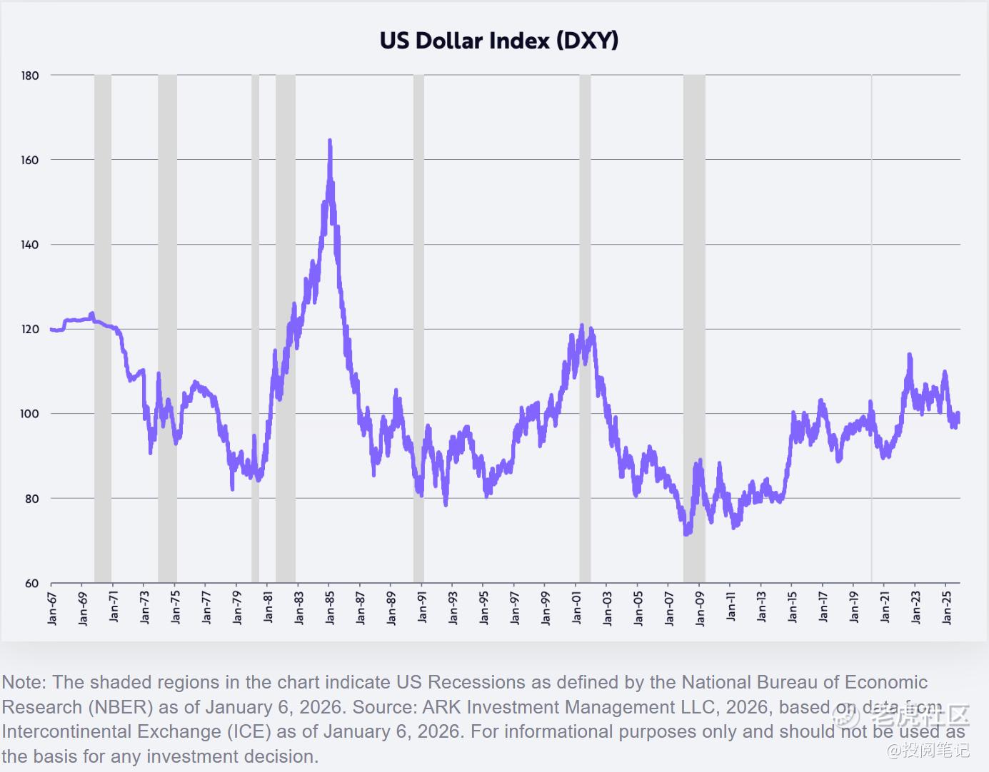 过去几年盛行一种观点,认为美国例外主义已走到尽头——美元在上半年创下1973年以来最大跌幅,在日历年基础上更是自2017年以来最大跌幅。去年以贸易加权美元指数(DXY)衡量,美元上半年下跌11%,全年下跌9%。若我们对财政政策、货币政策、放松管制及美国主导技术突破的展望准确,美国投资资本回报率将相对全球其他地区提升,从而推升美元汇率。特朗普政府的政策正重现1980年代里根经济学初期的景象——如下图所示,当时美元汇率几乎翻倍。
