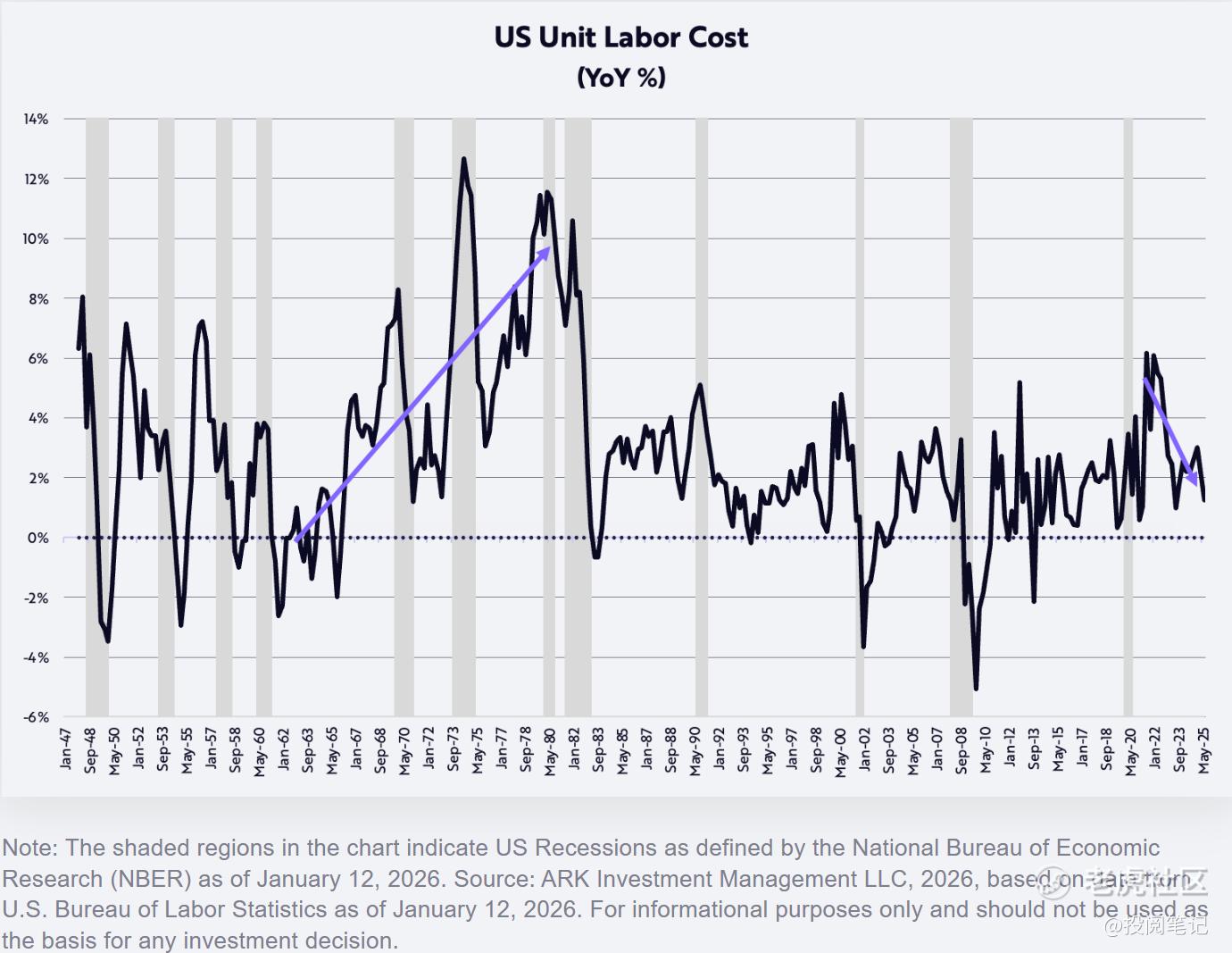 最后,作为抑制通胀的最强劲力量之一,非农生产率逆势而上,第三季度同比增长1.9%。相较于人均工时薪酬3.2%的增幅,生产率提升使单位劳动力成本通胀率降至1.2%(见下图)。该数据中完全不存在七十年代式的成本推动型通胀!