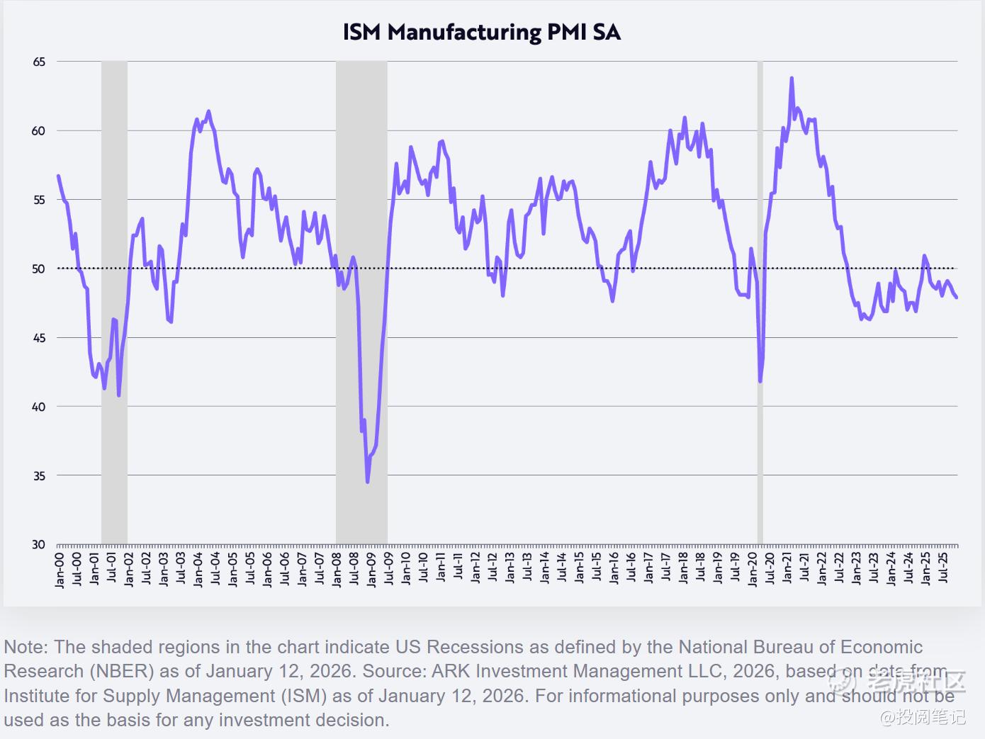 根据美国采购经理人指数(PMI)测算,制造业已持续萎缩约三年。如下图所示,该指数以50为扩张与萎缩的分界点。