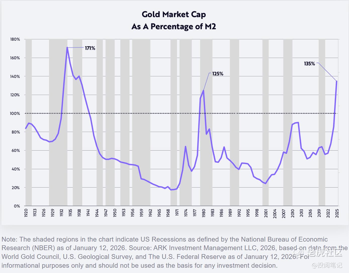 以市值与M2货币供应量的比率衡量,过去125年中黄金价格仅有一次更高——即1930年代初大萧条时期,当时金价被固定在每金衡盎司20.67美元,而M2货币供应量暴跌约30%,如下图所示。近期金价与M2比率已突破1980年通胀与利率双双飙升至两位数时的历史峰值。换言之,从历史维度看,当前金价已达极端水平。
