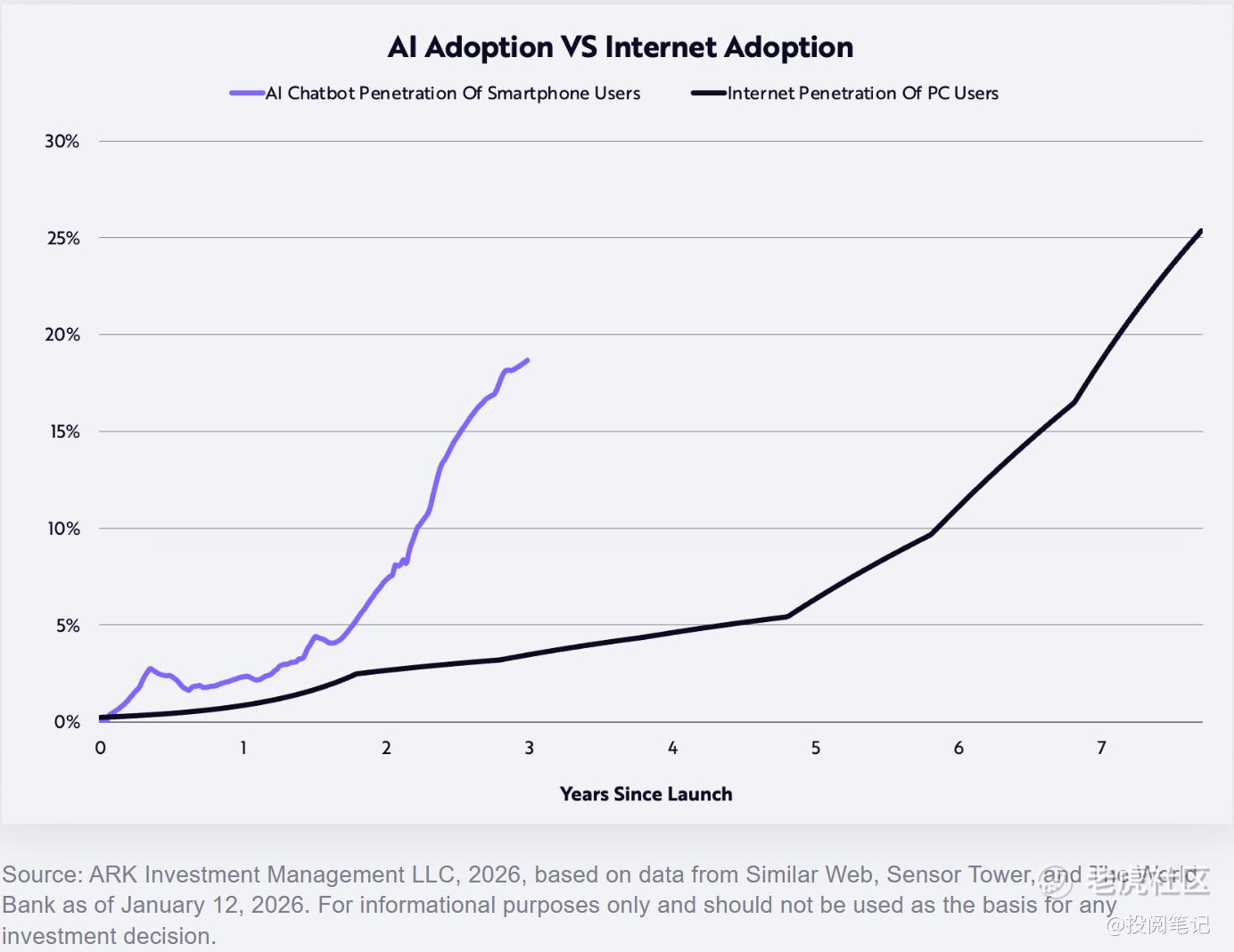 除公开市场中的半导体企业与大型云服务商外,投资回报的增长正惠及尚未上市的人工智能原生企业。人工智能公司正成为史上增长最快的商业形态之一。据我们研究显示,消费者采用人工智能的速度是九十年代采用互联网速度的两倍,如下图所示。
