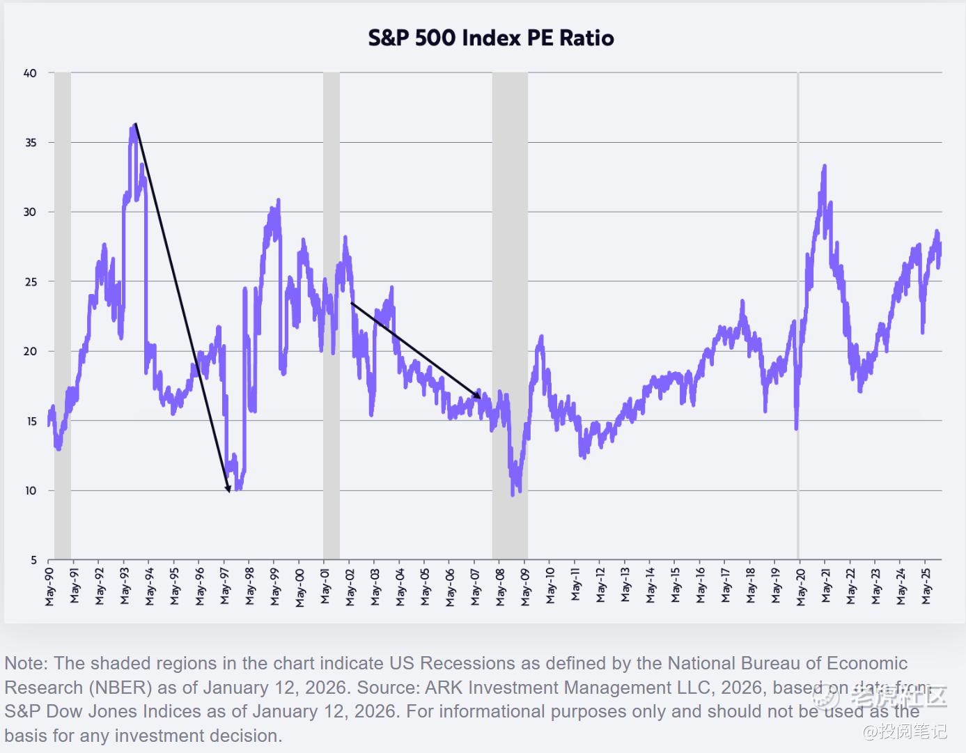 如下图所示,当前股市估值处于历史区间高位,引发众多投资者担忧。我们自身的估值假设是:市盈率(P/E)倍数将回落至过去35年20倍的平均水平。历史上最显著的牛市往往伴随市盈率压缩而形成。例如1993年10月中旬至1997年11月中旬,标普500指数年化回报率达21%,同期市盈率从36倍降至10倍。同样,2002年7月至2007年10月间,标普500指数年化回报率达14%,同期市盈率从21倍压缩至17倍。鉴于我们预期生产率驱动的实际GDP增长将加速而通胀将放缓,本轮市场周期应呈现相同动态——或许更为显著。