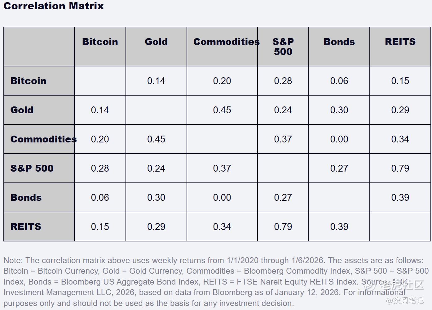 资产配置者还需重点关注比特币回报率的低相关性——不仅与黄金回报率相关性低,自2020年以来与其他主要资产类别的相关性同样较低(见下表)。有趣的是,比特币与黄金的相关系数甚至低于标普500指数与债券的相关系数。换言之,对于未来数年寻求单位风险更高回报的资产配置者而言,比特币应是理想的分散投资工具。
