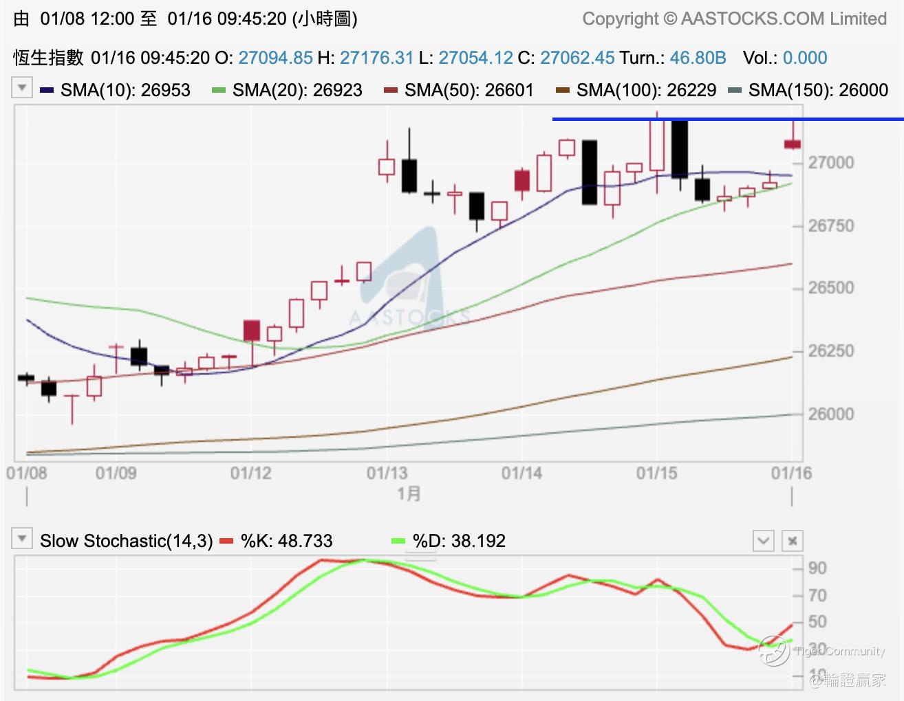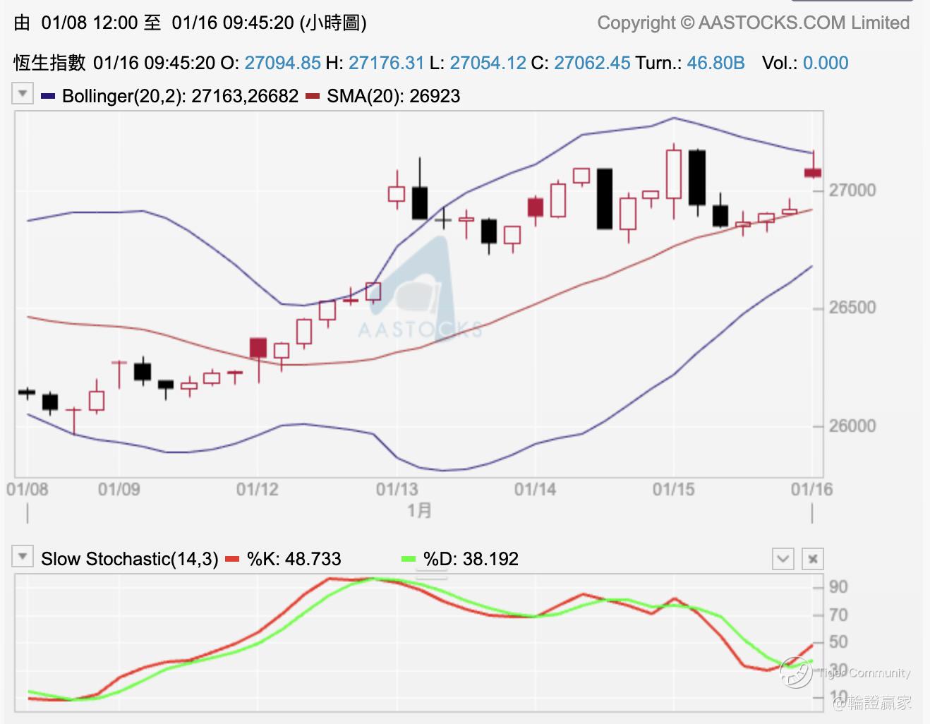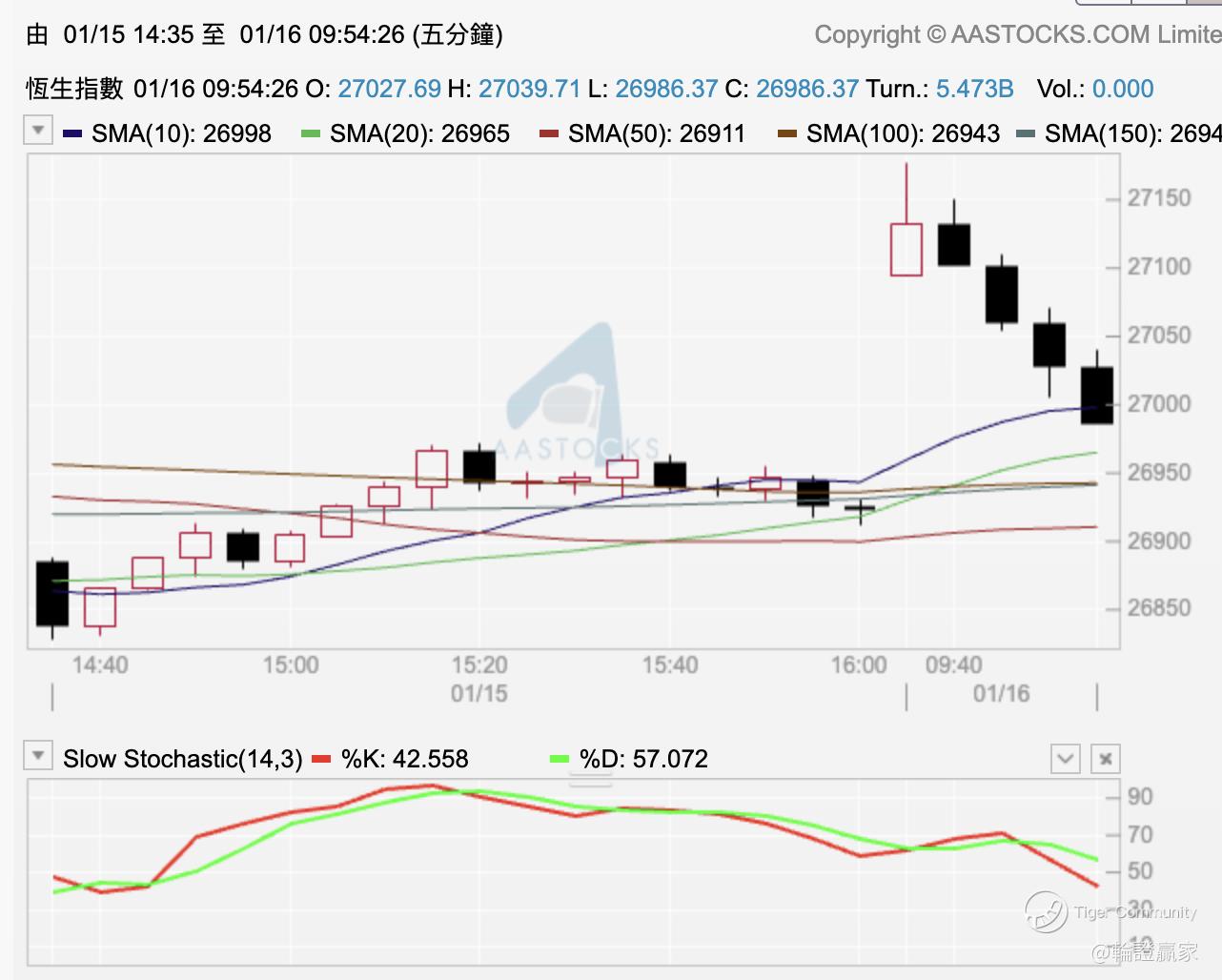 假如到出文后你睇完见小时图10/20线守得住指数嘅话, $MS#HSI RC2812C.C(53861)$ ,收回价26608点,同现价有约480点距离,杠杆有约60.2倍为市场上第二高杠杆牛证,所以,一旦见到小时图10/20线无支持嘅话,咁就唔好出啦;反过来借五分钟图Slow STC(14.3)做Swing Trade触底上又唔反对嘅。