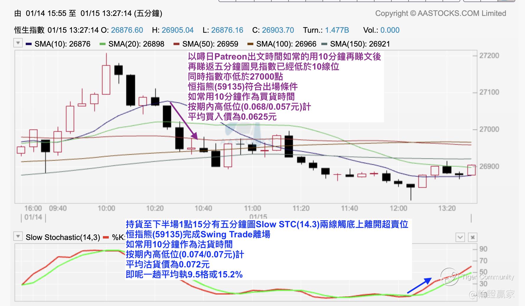 㖊日拣咗只 $UB#HSI RP2802Q.P(59135)$ 出嚟,出文时都已经先指数由272楼上向下落紧,五分钟图Slow STC(14.3)亦已经向下,(59135)杠杆都有约超过50倍计,借五分钟图嘅Slow STC(14.3)做Day Trade走一趟,平均都有15.2%正数执到。