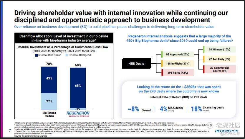 这并非再生元第一次提出类似策略。2024—2025 年,公司在 BD 方面的现金投入仅占总经费的 3%,远低于 27% 的行业平均水平。