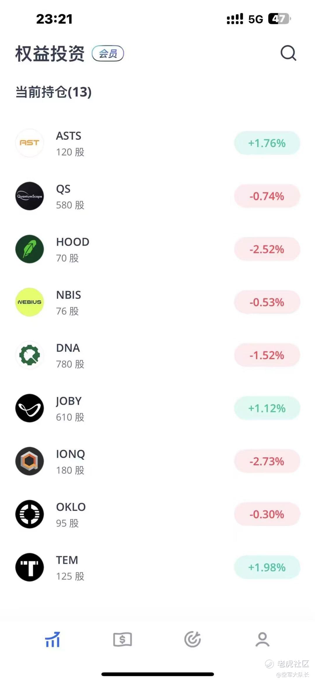 至于像现在不涨的股票,DNA,JOBY,IONQ,QS这些股票都是有涨十倍的潜力,现在价格也不高,还在底部,这些股票大跌可能性不大,就是一直在横盘,万一哪天像ASTS,RKLB,FIGR这样涨起来呢。