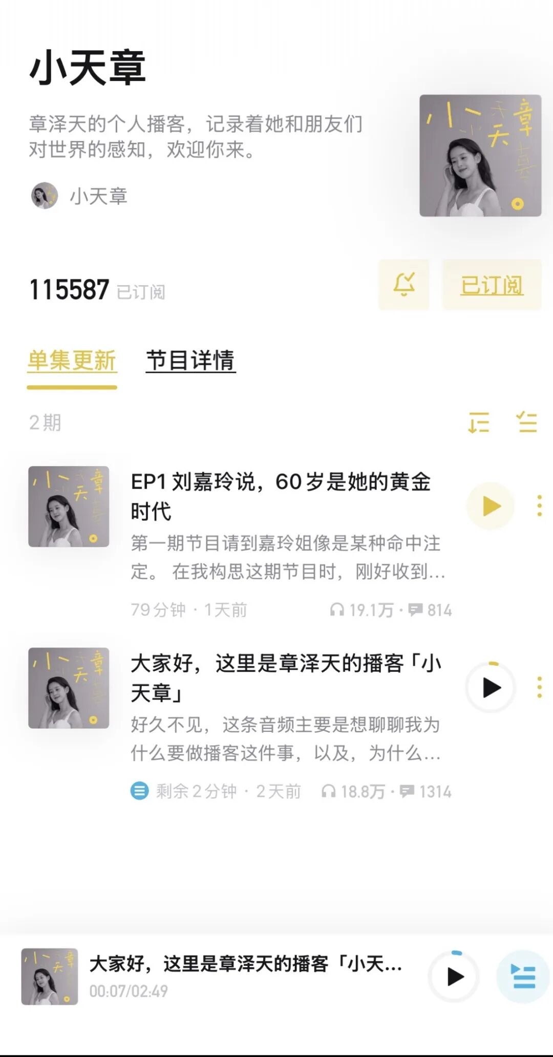 章泽天入驻小宇宙App仅2天时间,发布了两条播客内容,目前的订阅量就近11.5万,单集节目的播放量都在18万以上,单集评论量平均破千,第一条内容只有2分钟,主要跟大家打招呼的,第二期内容时长79分钟,但播客嘉宾是老牌女明星刘嘉玲。