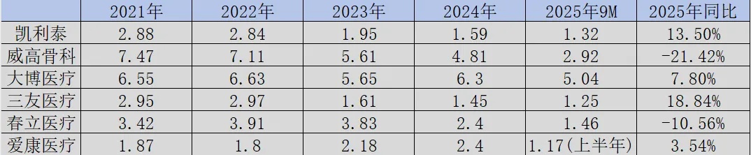 此外,集采政策有效压缩了行业中间流通环节,削减了不必要的市场营销开支,过去高企的渠道成本与营销费用得以大幅降低,各大骨科企业销售费用增长态势均明显放缓。其中,威高骨科的销售费用表现尤为典型:从2021年的7.47亿元逐年回落,2025年前三季度仅为2.92亿元,较2021年同期降幅达47.1%,降本增效成效显著。